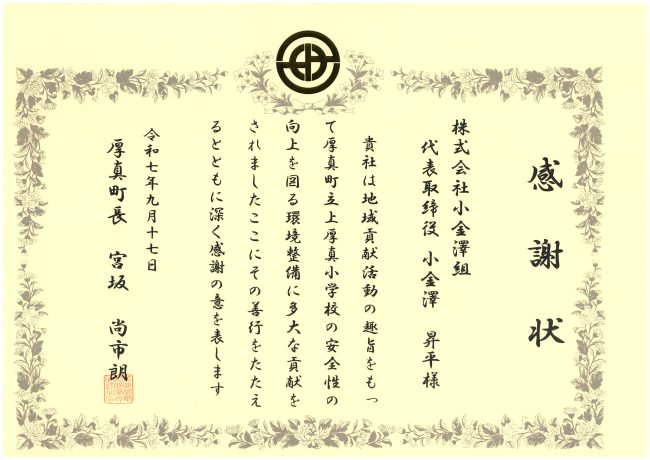 厚真町様より感謝状をいただきました 2025.09.17 室蘭建設管理部発注「厚真川改修工事2工区(補正繰越)」において実施した地域貢献活動に対して、厚真町様より感謝状をいただきました。 ← 前の記事 2025年9月 2025年7月 2025年6月 2025年4月 2025年3月 2025年2月 2024年11月 2024年10月 2024年9月 2024年7月 2024年6月 2024年4月 2024年2月 2024年1月 2023年11月 2023年10月 2023年7月 2023年6月 2023年3月 2023年1月 2022年11月 2022年10月 2022年7月 2022年6月