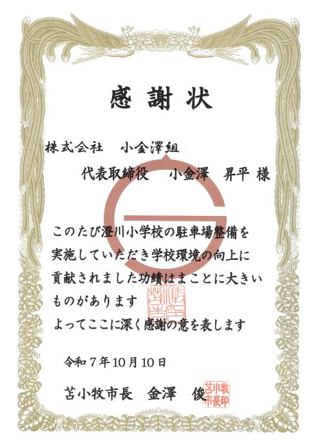 苫小牧市様より感謝状をいただきました 2025.10.10 室蘭開発建設部発注「樽前山火山砂防工事の内熊の沢川3号砂防堰堤外工事」において実施した地域貢献活動に対して、苫小牧市様より感謝状をいただきました。 ← 前の記事 2025年10月 2025年9月 2025年8月 2025年7月 2025年6月 2025年4月 2025年3月 2025年2月 2024年11月 2024年10月 2024年9月 2024年7月 2024年6月 2024年4月 2024年2月 2024年1月 2023年11月 2023年10月 2023年7月 2023年6月 2023年3月 2023年1月 2022年11月 2022年10月